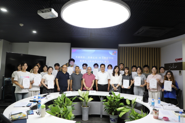 为总结实习成效,深化校企协同育人成果,2025年8月1日下午,南京工业职业技术大学商务贸易学院与江苏苏豪国际集团股份有限公司在苏豪国际广场A座415会议室联合举行2025年暑期实习阶段性总结汇报会。本次会议标志着为期一个月的暑期认知实践活动圆满落下帷幕。
