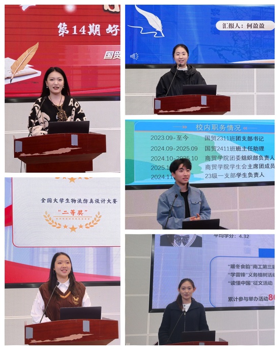 此次分享会邀请了国贸2211班何盈盈、国贸2211班侯宇轩、国贸2311班俞可为、电商2385班陶安琪、物流2211班孙晔5位国家奖学金获得者,分享他们在学习、实践、工作、参赛等方面的经验,分享他们精彩的青春故事。