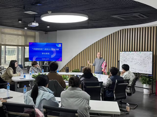 2025年12月5日,2025级国际经济与贸易专业苏豪精英班在班主任李智老师带领下走进苏豪控股集团,开展企业参观与第二课堂“移动课堂”学习活动。苏豪股份党委副书记张培根亲切接待并为同学们授课。本次活动旨在让学生走进真实外贸场景,深化专业理解,增进校企协同育人成效。