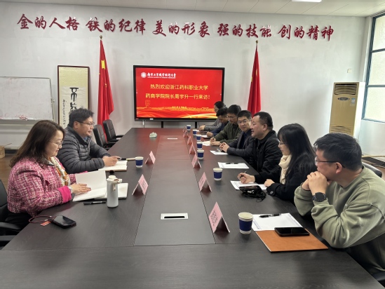 12月19日上午,浙江药科职业大学药商学院院长周宇升率七人团队到访商务贸易学院进行交流,商务贸易学院院长阮晓文等参与接待。