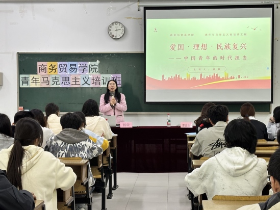 为深入学习贯彻习近平新时代中国特色社会主义思想,引导青年学子坚定理想信念、厚植家国情怀、勇担时代使命,3 月 25 日下午,商务贸易学院分团委特邀马克思主义学院杨敬老师在求真楼308 教室作题为《爱国・理想・民族复兴:中国青年的时代担当》的专题讲座,学院青马班全体学员参与本次讲座。